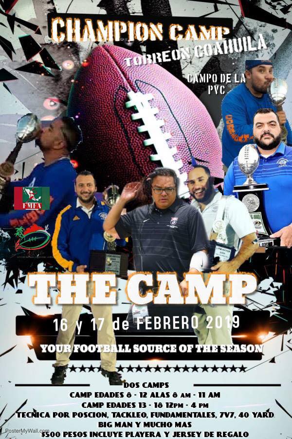 Ciudad Victoria Tamaulipas.- la Liga de Football Americano Laguna AC invita a la comunidad del deporte de las tacleadas en categorías de 8 a 18 años a su segundo campamento de football ‘Champion Camp’, a llevarse a cabo el 16 y 17 de Febrero del próximo año en la ciudad de Torreón, Coahuila.