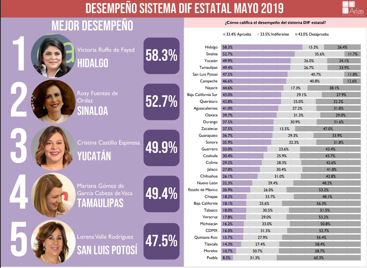 Los resultados de la encuesta correspondiente al mes de mayo, coloca de esta manera el Top 5 de las Presidentas de los DIF Estatales; en la primera posición aparece Victoria Ruffo de Fayad del estado de Hidalgo, Rosy Fuentes de Ordaz del Estado de Sinaloa, Cristina Castillo Espinosa de Yucatán, Mariana Gómez de García Cabeza de Vaca de Tamaulipas y Lorena Valle Rodríguez, de San Luis Potosí.