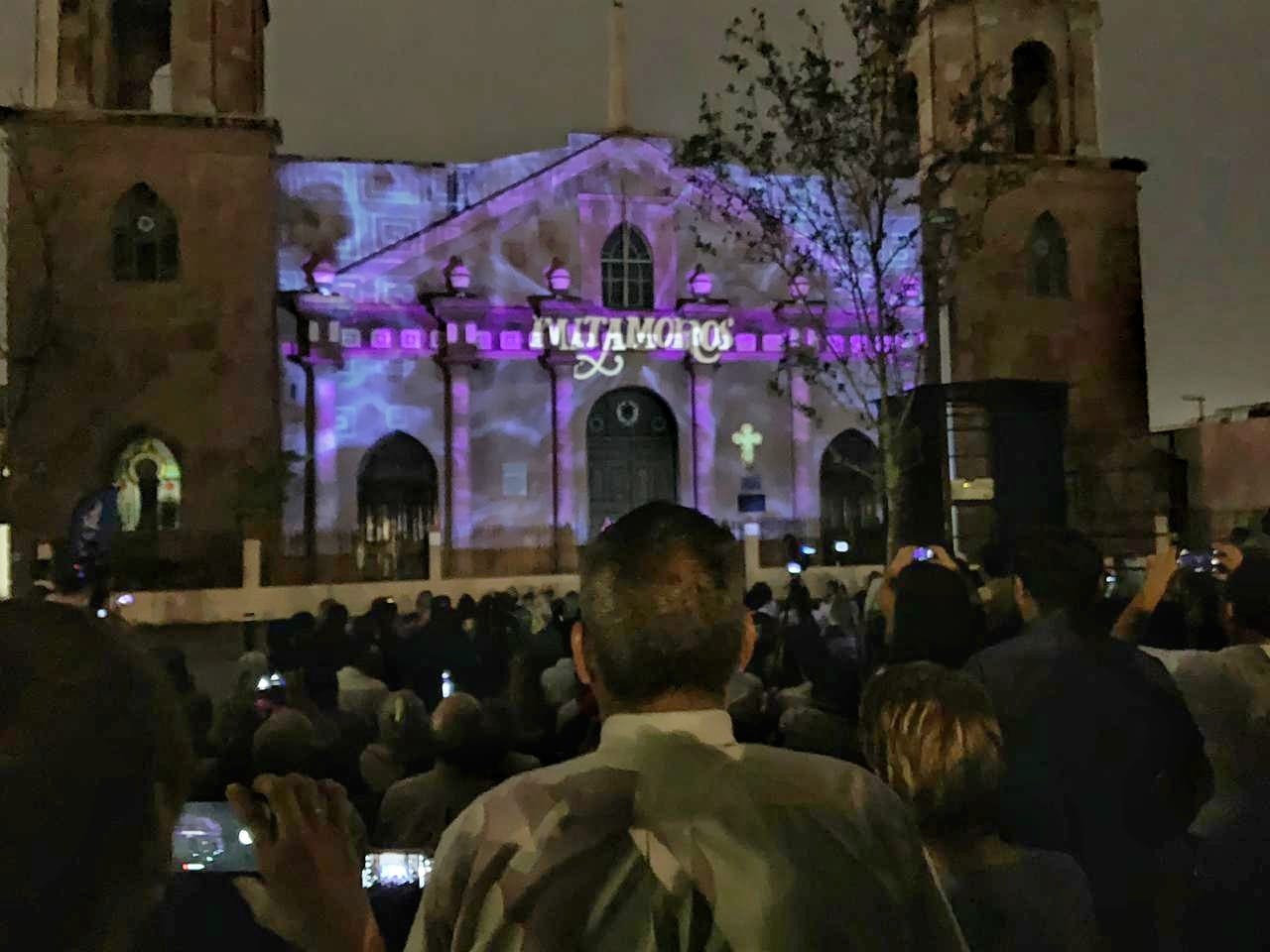 Matamoros, Tamaulipas. – Ayer por la noche la fachada de la Iglesia Catedral de Nuestra Señora del Refugio de Matamoros se llenó de luz para recordar los momentos más emblemáticos de su historia con el video mapping “Matamoros: Leal, invicta y heroica”.