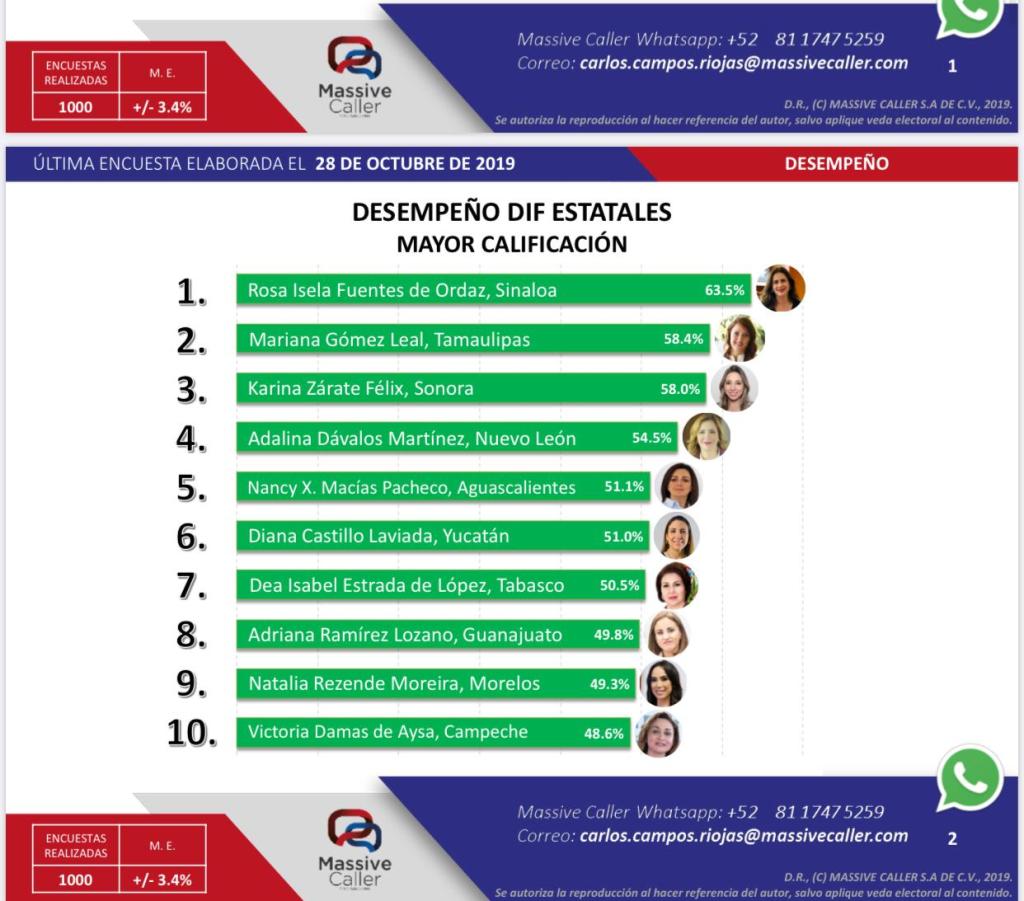 Con base en la última encuesta realizada por la empresa el 28 de octubre a través de redes sociales, el 58. 4 por ciento de la población tamaulipeca aprobó el trabajo que ha venido haciendo la titular del DIF en Tamaulipas.