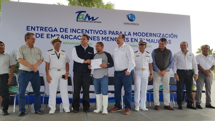 Matamoros, Tamaulipas.- El Gobierno de Tamaulipas a través de la Secretaría de Pesca y Acuacultura, junto al Comisionado de Acuacultura y Pesca, Raúl Elenes Angulo, dieron inicio a la entrega de incentivos del Subcomponente Modernización de Embarcaciones Menores ejercicio 2019 en el Puerto del Mezquital de este municipio. Dicho programa habrá de culminar a fines de este año e inicios de 2020.