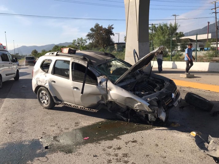 El segundo accidente se presentó en el eje vial donde participó una camioneta Renault tipo Duster en color arena la cual presuntamente se desplazaba a exceso de velocidad sobre la mencionada arteria vehícular, presuntamente el conductor de la camioneta pierde el control de la unidad y termina por subirse al camellón derribar varios señalamientos dando de volteretas y quedando en posición normal, así mismo los tripulantes de la camioneta fueron valorados por elementos de protección civil municipal que es informaron que las heridas no eran de consideración y por ello no trasladaron a ninguna persona a un centro hospitalario.