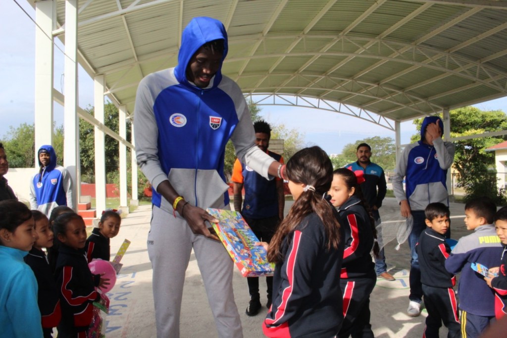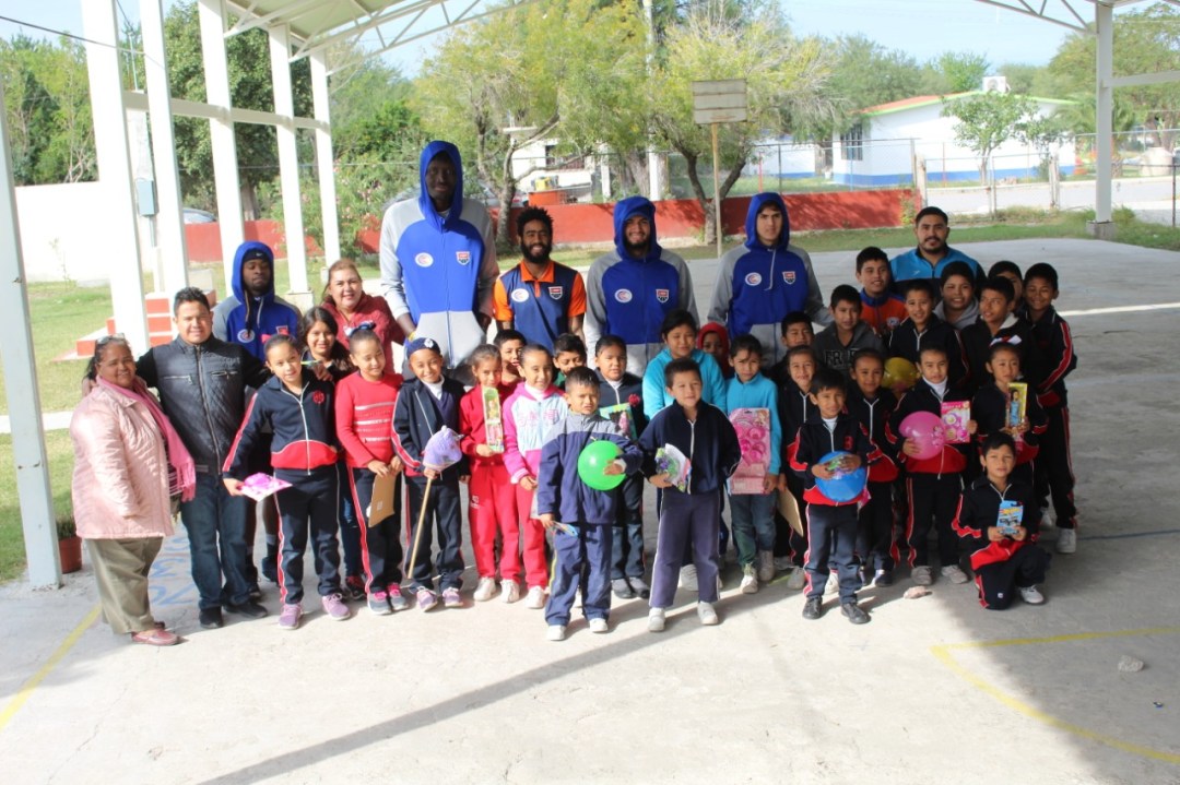 Mamadou N’Diaye, Kennedy Jones, Bernardo Polanco, Erick Vega y Daniel González, hicieron entrega de los juguetes a los alumnos de estas instituciones educativas, a nombre de la Universidad Autónoma de Tamaulipas y del Club Correcaminos de la Liga Nacional de Baloncesto Profesional.