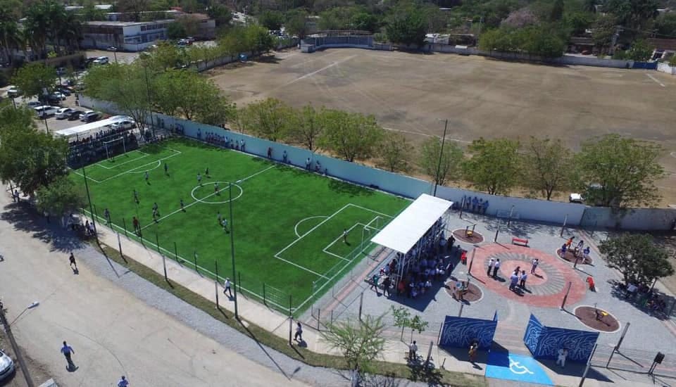 En la zona centro pero en El Mante, se terminó una cancha de fútbol de pasto sintético que cuenta con alumbrado, graderío y baños, obra que beneficiará a cientos de deportistas de la zona cañera.