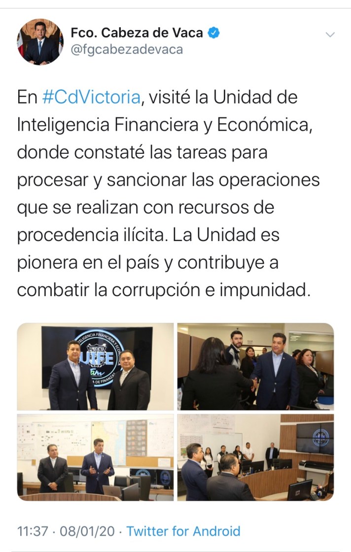 “Visité la Unidad de Inteligencia Financiera y Económica, donde constaté las tareas para procesar y sancionar las operaciones que se realizan con recursos de procedencia ilícita”, comentó el mandatario estatal, expresó el gobernador es su cuenta de Twitter.