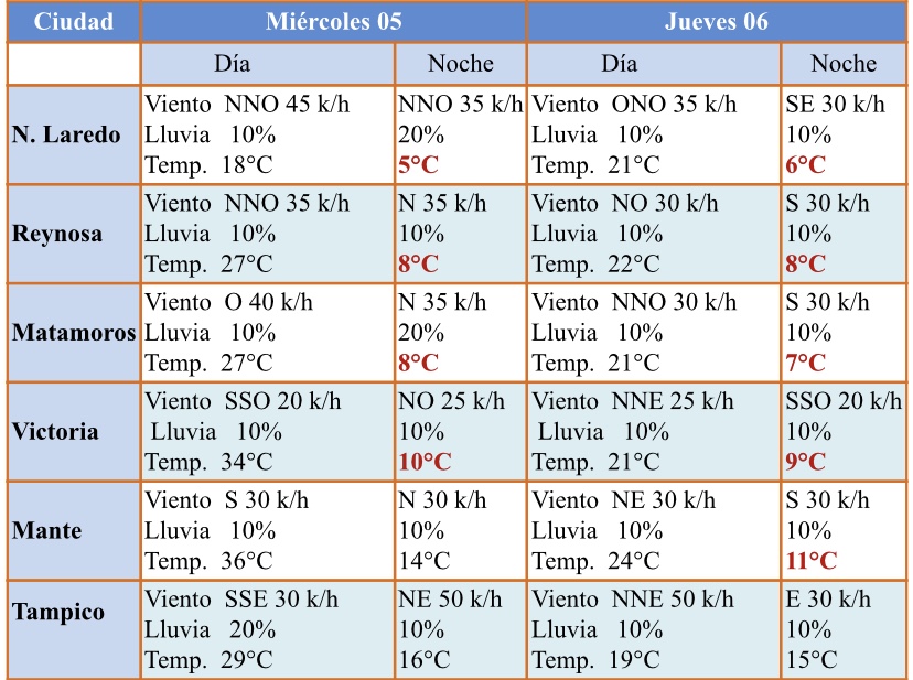 Zona Centro: Se prevé a partir del miércoles temperatura máxima de 34°C y mínimas de 9°C, con viento moderado de dirección norte de 20-25 km/h con rachas que podrían superar los 50 km/h principalmente en zonas costeras.Baja probabilidad de lluvia ligera durante el periodo de pronóstico. Se mantendrá clima frío en zonas altas (mínima de 3°C durante la noche en Miquihuana).