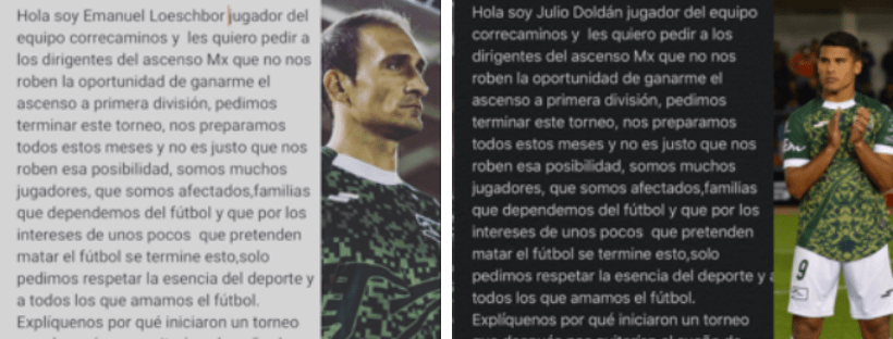 »No nos roben la oportunidad de ganarme el ascenso a primera división, pedimos terminar este torneo, nos preparamos todos estos meses y no es justo que nos roben esa posibilidad, somos muchos jugadores que somos afectados, familias que dependemos del fútbol y que por los intereses de unos pocos que pretenden matar el fútbol se termine esto, solo pedimos respetar la esencia del deporte y a todos los que amamos el fútbol. Explíquenos porque iniciaron un torneo que después nos quitarían el sueño de ascender, tiene que haber ascenso y descenso, por que eso es lo que hace competitiva y grande a una liga».