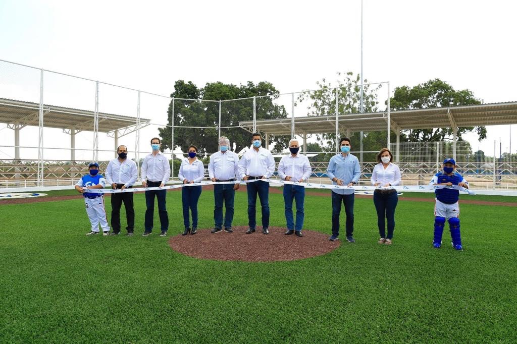 Por su parte, el campo de béisbol infantil cuenta con pasto sintético, tiene zona de gradas para espectadores, zonas para los equipos de local y visitante, sanitarios y lámparas de tipo led de primera generación.