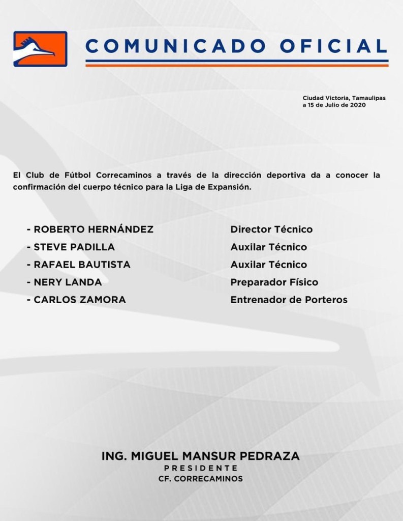 Roberto Hernández continuará al mando de la plantilla como Director Técnico, Steve Padilla y Rafael Bautista como auxiliares técnicos.