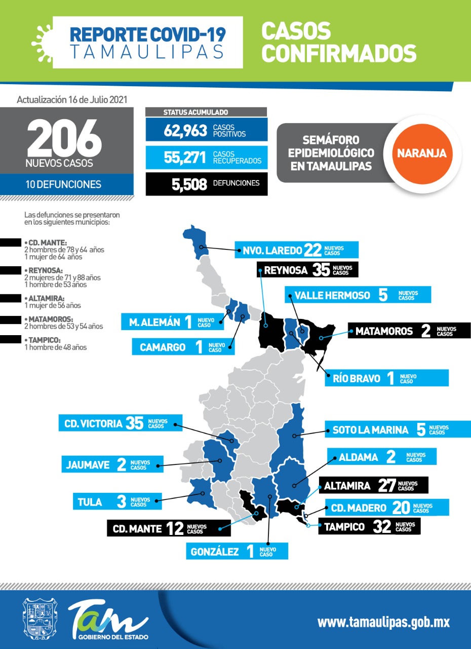 Tras confirmar 206 nuevos casos de COVID-19 y 10 defunciones asociadas a complicaciones graves por la enfermedad, la secretaria de Salud, Gloria Molina Gamboa pidió a las y los tamaulipecos reforzar las medidas preventivas ya conocidas, evitar salidas innecesarias y lugares aglomerados, ya que representan una de las formas principales de contagio.