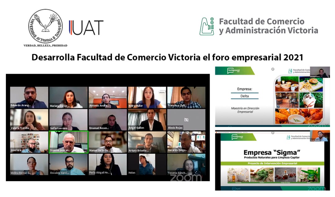 La Facultad de Comercio y Administración Victoria (FCAV) de la Universidad Autónoma de Tamaulipas (UAT) llevó a cabo el Foro Empresarial 2021 “Resiliencia Empresarial”, con el propósito de presentar proyectos de investigación derivados de la vinculación con empresas de la región.