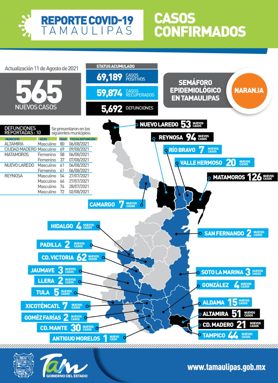 Luego de confirmar 565 nuevos contagios de COVID19, el pico más alto de la pandemia en lo que va del 2021, la secretaria de Salud de Tamaulipas, Gloria Molina Gamboa hizo un llamado urgente a la población a quedarse en casa el mayor tiempo posible, limitar el contacto social y evitar exponer a niños y adultos mayores a un contagio que pudiera derivar en complicaciones graves. Pidió evitar salidas innecesarias y a quienes deban hacerlo, insistió en portar cubrebocas en todos los espacios públicos, evitar sitios aglomerados, lavarse las manos frecuentemente o aplicarse alcohol en gel al 70 por ciento y mantener una distancia mínima de 2 metros con otras personas.