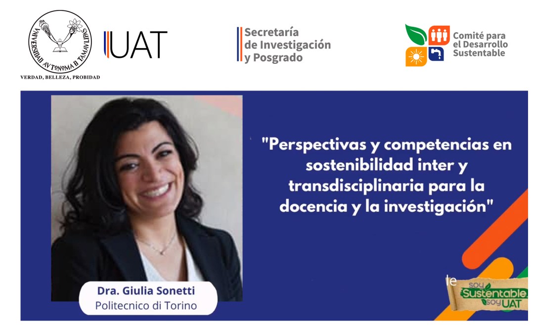 La Universidad Autónoma de Tamaulipas (UAT), por medio del Comité para el Desarrollo Sustentable, llevó a cabo la conferencia virtual “Perspectivas y competencias en sostenibilidad inter y transdisciplinaria para la docencia y la investigación”, dictada por la Dra. Giulia Sonetti, profesora del Politécnico de Torino, Italia.