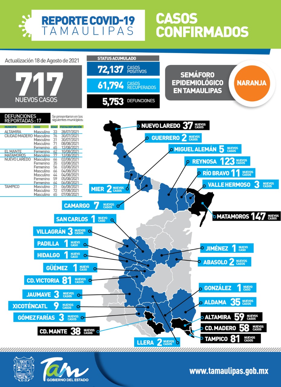 Tamaulipas llegó hoy al pico más alto de la pandemia de COVID-19 al confirmar 717 nuevos casos y 17 fallecimientos por complicaciones graves, informó la secretaria de Salud, Gloria Molina Gamboa quien urgió a la población a vacunarse, quedarse en casa el mayor tiempo posible y reforzar las medidas preventivas para mitigar el impacto de la tercera ola de contagios. La titular de la SST dijo que el lavado frecuente de manos con agua y jabón inactiva el virus, el uso del cubrebocas reduce la probabilidad de transmisión y mantener una distancia mínima de 2 metros con otras personas, disminuye el riesgo de exposición a inhalaciones que, al hablar, estornudar o toser puedan generar personas contagiadas.