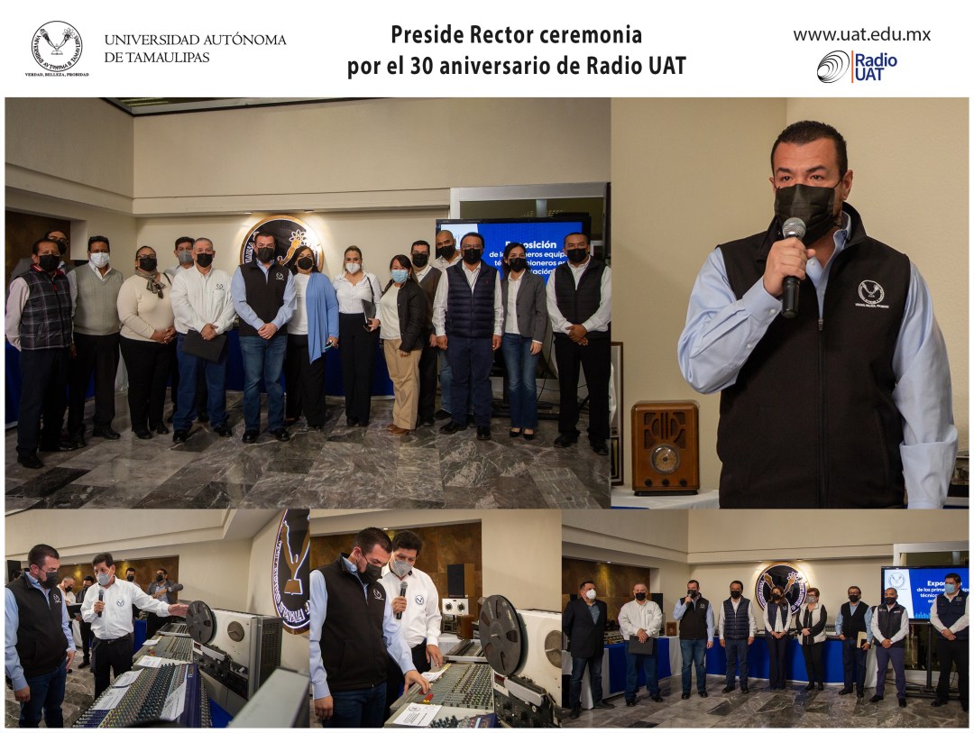 El C. P. Guillermo Mendoza Cavazos, Rector de la Universidad Autónoma de Tamaulipas, presidió el actoconmemorativo del trigésimo aniversario de la fundación deRadio UAT, ceremonia celebrada en el vestíbulo del edificio de la Rectoría, en esta capital.