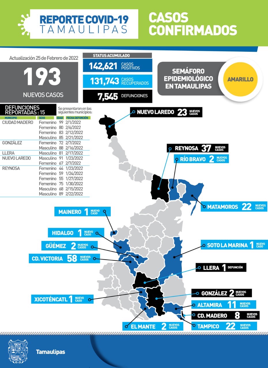 En su reporte COVID-19 de este viernes, la Secretaría de Salud de Tamaulipas confirmó 193 positivos y 15 defunciones, insistiendo en su llamado a proteger a los más vulnerables y evitar sitios aglomerados para cortar la cadena de transmisión de virus.