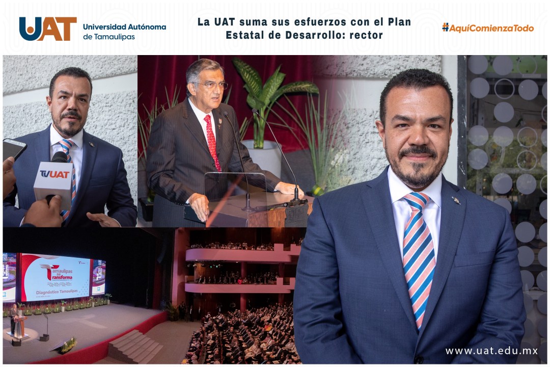 El C. P. Guillermo Mendoza Cavazos destacó su reconocimiento a las políticas estratégicas del gobernador Américo Villarreal Anaya y reafirmó el compromiso de la Universidad Autónoma de Tamaulipas (UAT) de sumar sus esfuerzos a las prioridades del Plan Estatal de Desarrollo (PED) 2023-2028 para lograr la transformación de Tamaulipas.