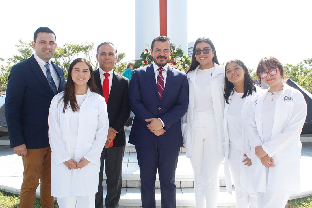 Como parte del protocolo, el C. P. Guillermo Mendoza Cavazos realizó la guardia de honor y colocó una ofrenda floral, acompañado de la Mtra. Elda Ruth de los Reyes Villarreal, directora de la Facultad de Derecho y Ciencias Sociales (FADYCS); y del Dr. Raúl de León Escobedo, director de la Facultad de Medicina de Tampico.