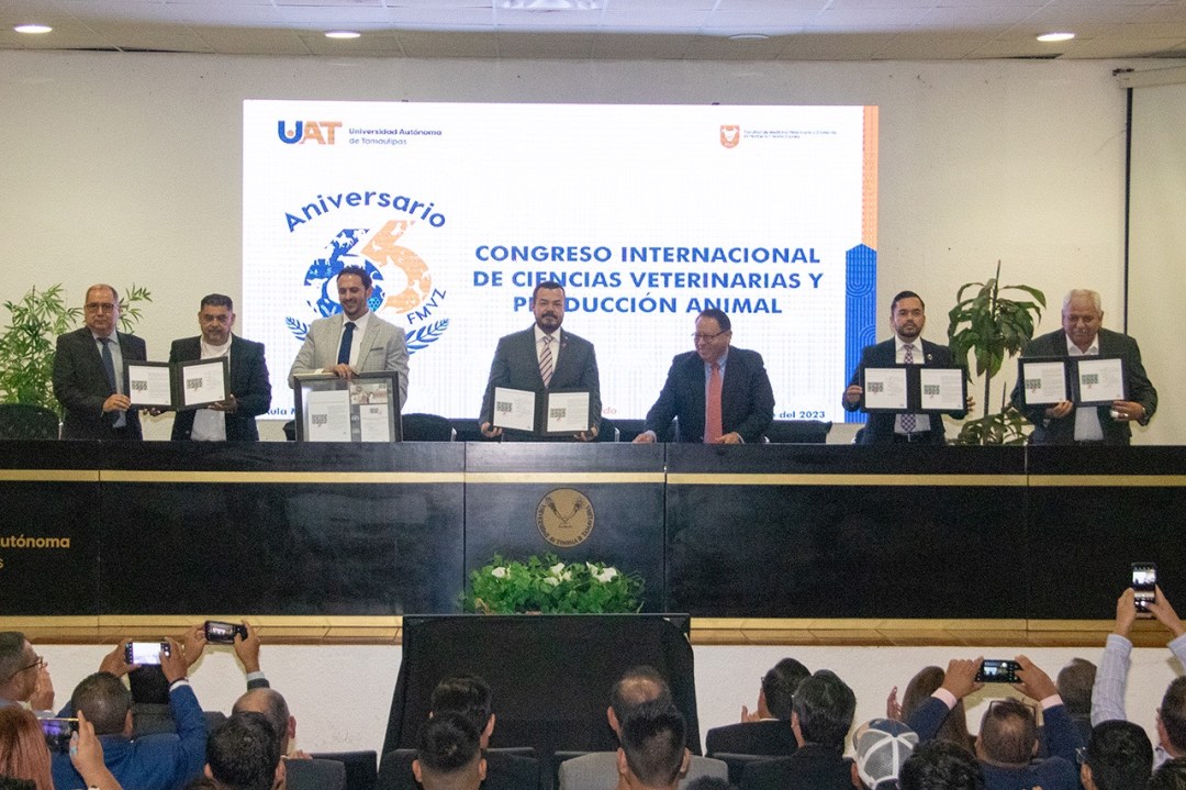 El C.P. Guillermo Mendoza Cavazos, rector de la Universidad Autónoma de Tamaulipas (UAT), presidió la ceremonia conmemorativa del 66 Aniversario de la Facultad de Medicina Veterinaria y Zootecnia (FMVZ-UAT) “Dr. Norberto Treviño Zapata”, en cuyo marco inauguró elPrimer Congreso Internacional de Ciencias Veterinarias y Producción Animal.