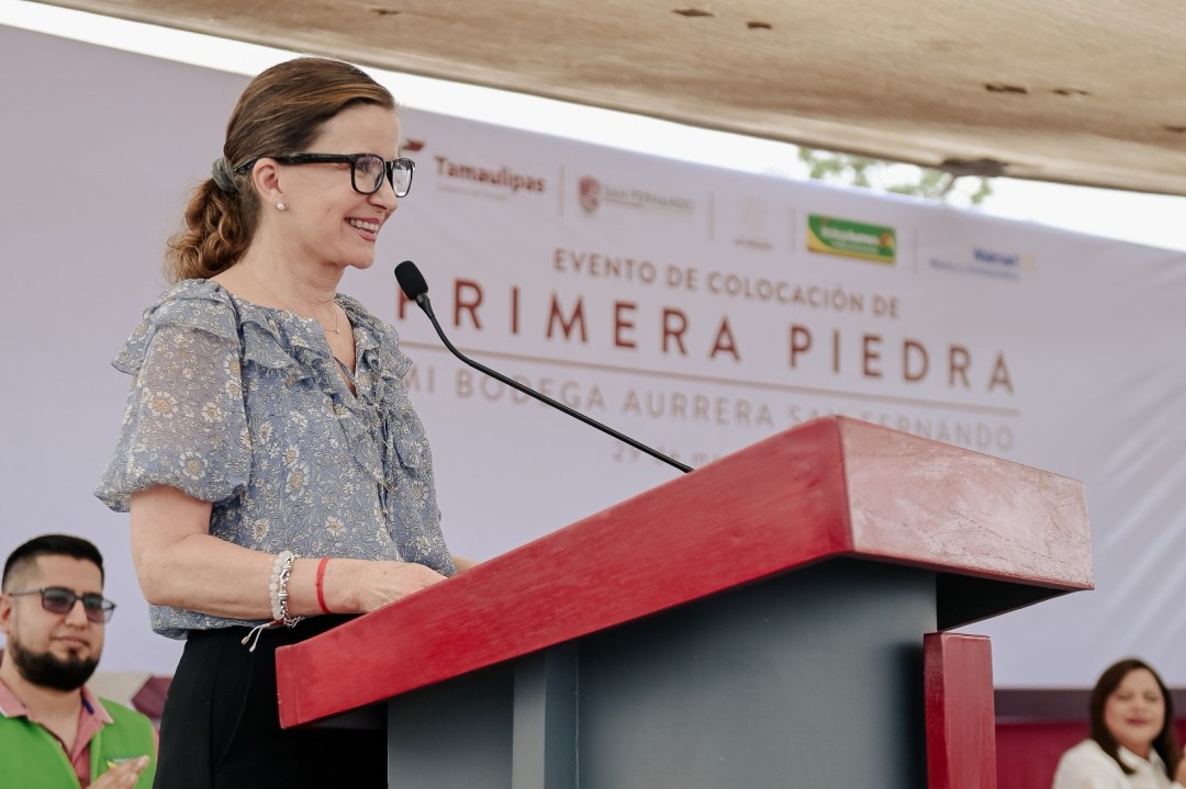San Fernando, Tamaulipas.– Como resultado del entorno de confianza para la inversión comercial en Tamaulipas, la secretaria de Economía, Ninfa Cantú Deándar junto con la presidenta municipal de San Fernando, Verónica Aguirre y Rodrigo Flores Amezcua, director de Relaciones Institucionales de Walmart de México encabezaron la ceremonia de colocación de la primera piedra para la construcción de la tienda Mi Bodega Aurrerá que representa una inversión de 50 millones de pesos.