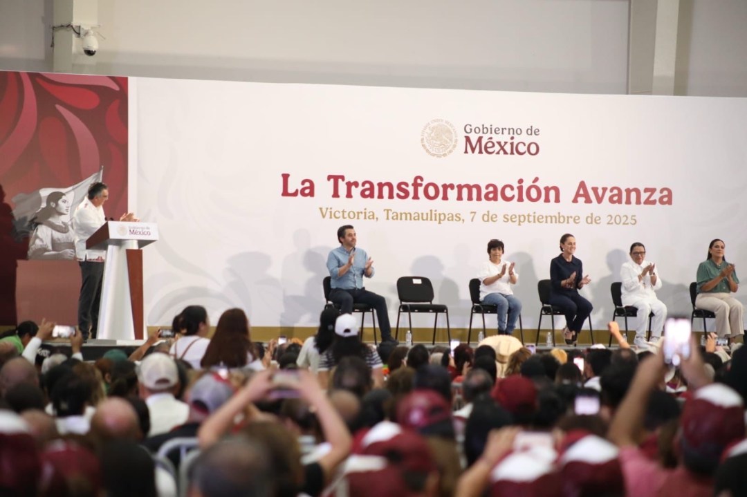 “Muchas gracias, Américo, por el trabajo que realizas, por tu entrega, tu consistencia, tu convicción y tu amor al pueblo de Tamaulipas. Felicidades, Américo, por el gran trabajo que estás haciendo”, expresó la presidenta de México, durante el evento “La Transformación Avanza en Tamaulipas”, como parte de su recorrido por todo el país con motivo de su primer informe de Gobierno, ante más de 10 mil personas, en el Polyforum de Ciudad Victoria.